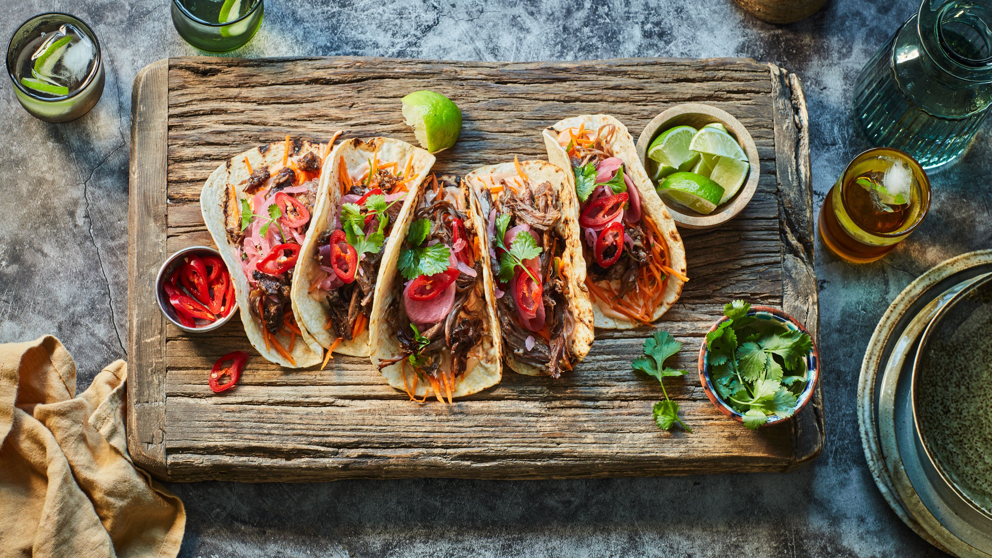 Top with pickled onion and a slice of chilli, then garnish with coriander and squeeze over some lime and you’re good to go.