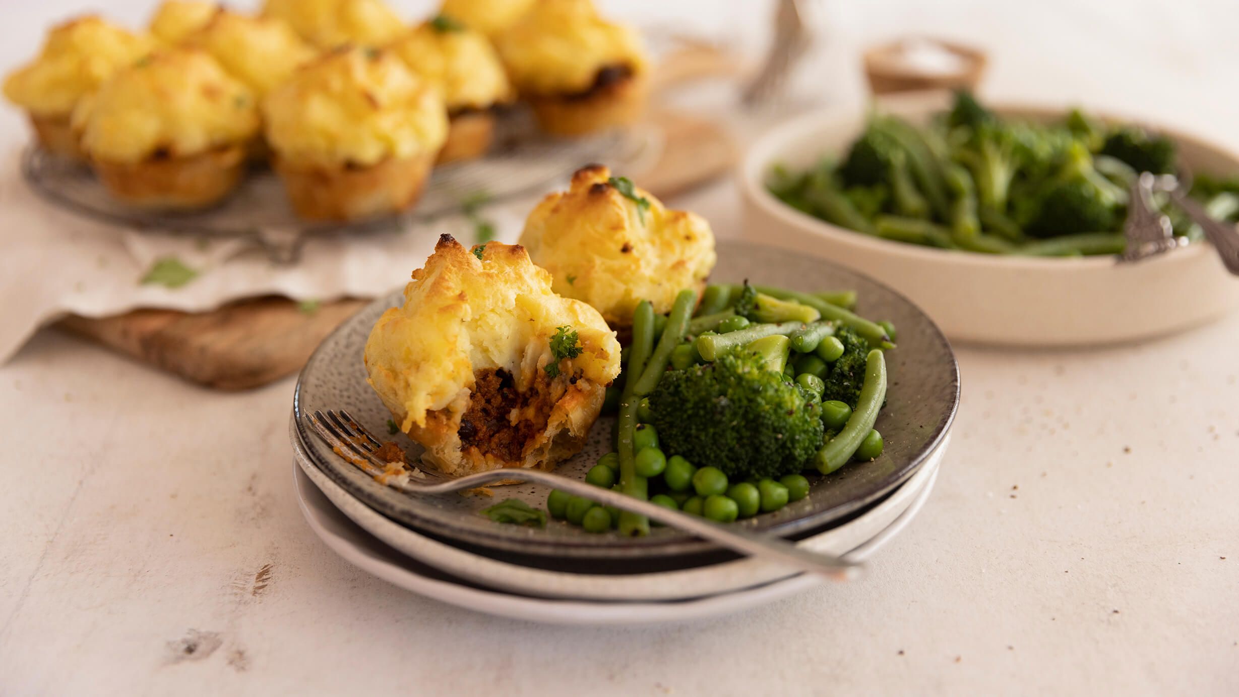 Sink your teeth into these mini Mexi-Mince Cheesy Mash Pies. A perfectly-sized plate of comfort food made into a delicious balanced meal with a side of seasonal vegetables.
