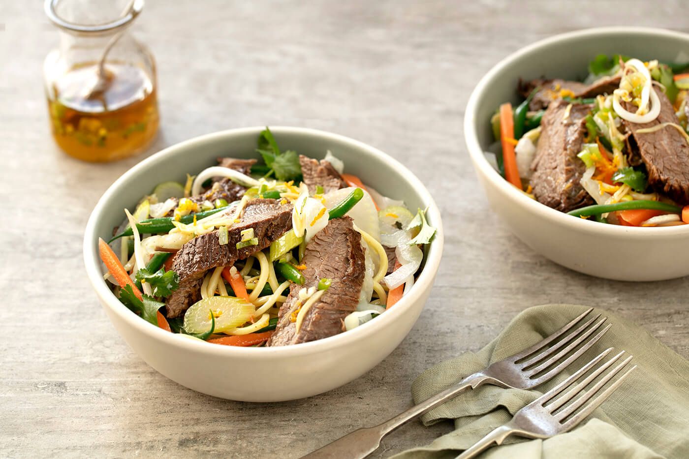 Cheaper cuts of meat are always suitable for marinating and long, slow cooking. Ask your butcher for thin flank steak, a tasty, circular piece of meat that is tender when cooked slowly. There are several stages to this recipe but none are time-consuming, and the flavours that hint at northern Asian are evident in the vegetables, flat noodles and delicious star anise aromas of the beef.